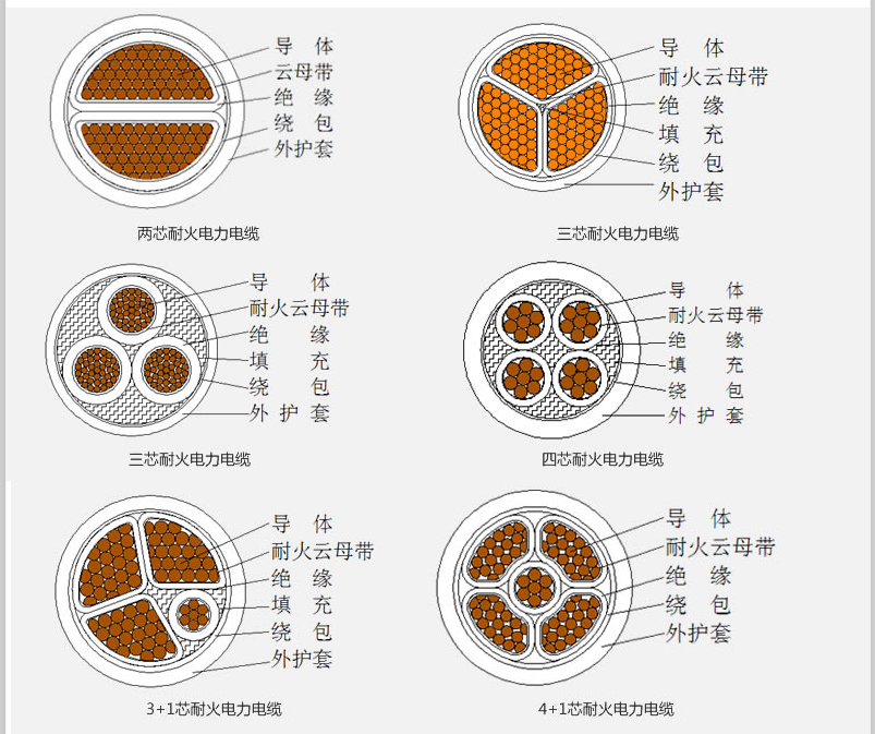 执行标准 耐火电缆产品执行GB/T12706-2020和GB/T19666-2019标准,等效于IEC60502-2004.耐火性特性符合国家标准GB/T19216.11-2003和IEC60331.11。 产品用途 耐火电缆就是在火焰燃烧情况下能够保持一定时间安全运行的电缆。耐火电缆适用于高层建筑、油田、电站、电厂、矿山、化工、地铁等要求防火安全条件高的场合,又是应急电源、消防泵、电梯、通讯型号系统的理想电缆。 使用特性 额定电压:0.6/1kV 敷设时的环境温度应不低于0℃ 敷设时的允许弯曲半径: 无铠装层的电缆,应不小于电缆外径的10倍 有铠装层的电缆,应不小于电缆外径的12倍 电缆满足GB/T19216.11-2003及IEC331规定的耐火特性要求 型号及名称